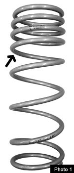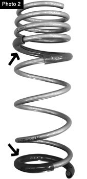 To prevent play at lower ride height, most low down springs these days are variable (or progressive) rate springs. As Photo 1 shows, the top and bottom end of variable rate springs are wound differently. The top part has a small pitch, and the bottom part a large pitch. The coil clashing sound often arises where the small pitch transitions into the large pitch (the arrow in Photo 1). No noise occurs in the small pitch part, because it’s fully compressed when the vehicle is jacked down, and remains so during driving.