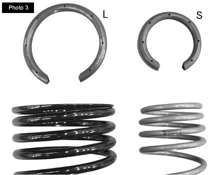 Diameters of low down springs vary, depending on the vehicle (Photo 3). Accordingly, the Silencer Rubber is available in sizes S, M and L; please choose the best fit for your spring size. An adhesive coating inside the Silencer Rubber makes it hard to come off, preserving its long-term effectiveness.