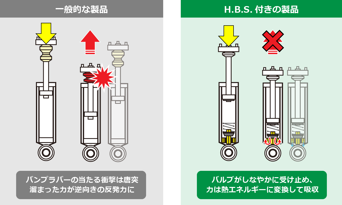 ※ショックアブソーバの破損に繋がりますのでH.B.S.搭載の製品もバンプラバーの装着は必要です。